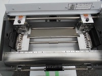 電動ピントラクタ※1とマージンスリッターが連動、マージンスリッターから発光するガイド光でスリットの位置合わせも簡単に行えます。給紙部は電動ピントラクタ方式※2、紙受け部は作業性重視のコンベア式です。処理速度は最大125m/分※3です。 FB-704:※1手動ガイド ※2ゴムローラー方式 ※3最大90m/分 ・機械を止めずに用紙を取り出せるコンベアースタッカーを採用。 ・紙送りはFB-704はゴムローラー方式、FB-705は電動ピントラクタ方式。